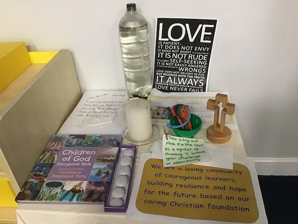 These spaces also contain a candle, cross and bible. The cloth on the table is changed to match the colour of the season of the church year – Green for growing, Purple for preparation and waiting, White for joy and celebration and Red for passion.